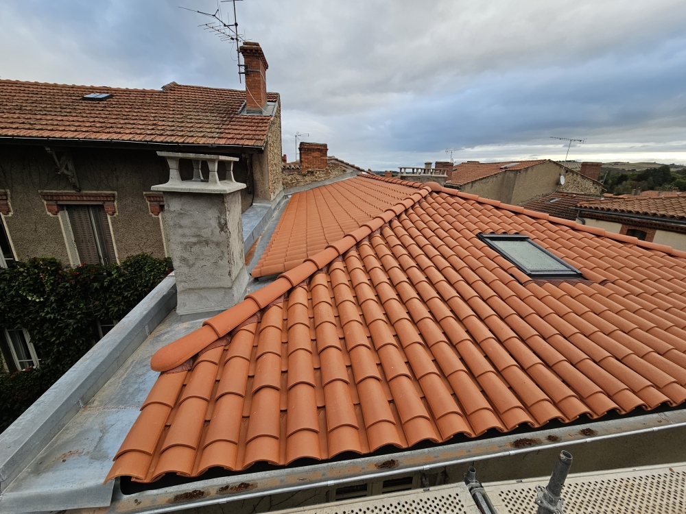 Votre entreprise, la SARL PAQUET, à rénové une couverture en tuile canalaverrou à Billom ainsi que le calage du toit, la zinguerie et la pose de fenetre de toit type Velux.